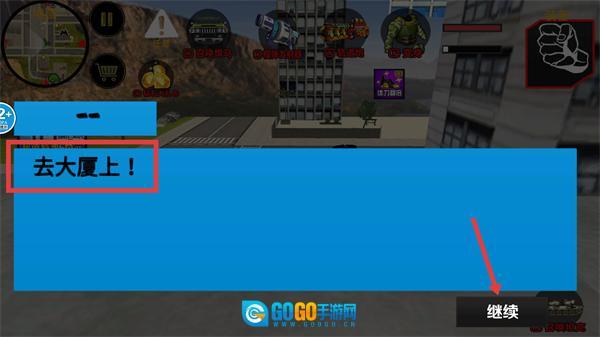 2、按照【去大厦上!】的任务指引,点击【继续】按钮,清晰了解任务目标后朝大厦区域行进。