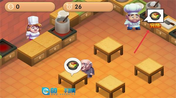 4、当厨师完成菜品制作后,界面会弹出【完成】的提示,这时工作人员就可以把菜品送到客人那里,以此完成整个服务流程。