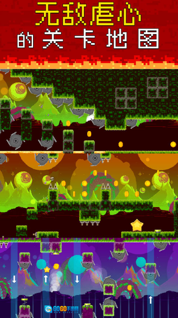 游戏的地图关卡中设置了不少陷阱,需要操控角色通过跳跃来避开它们。