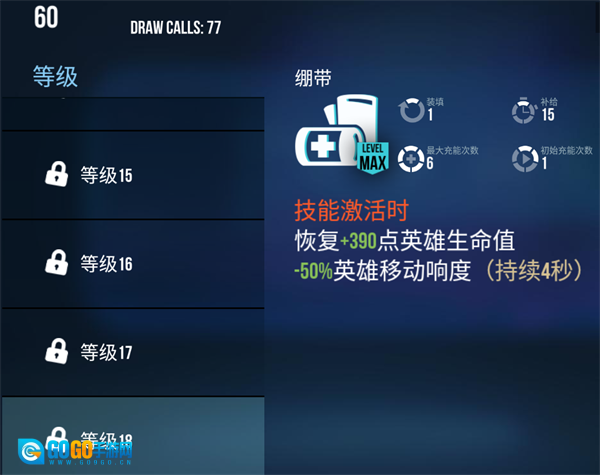 绷带技能激活后,能为英雄恢复70点生命值。并且随着技能等级的提高,不仅可以进一步增加生命值的恢复量,还能降低英雄移动时产生的声响。