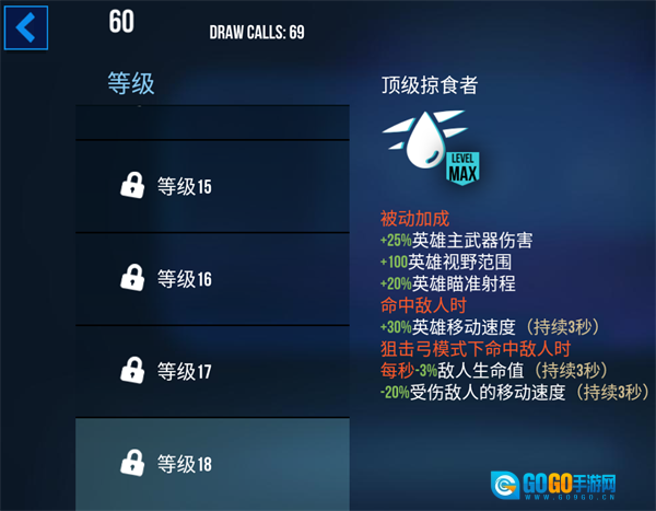 被动技能“顶级掠食者”能为英雄自身提供多项增益效果,包括提升瞄准射程、扩大视野范围、增加武器伤害、提高增伤比例、强化减速属性等,详细内容可在游戏内的技能说明中查看,且技能等级每提升一个阶段,这些加成效果都会随之增强。