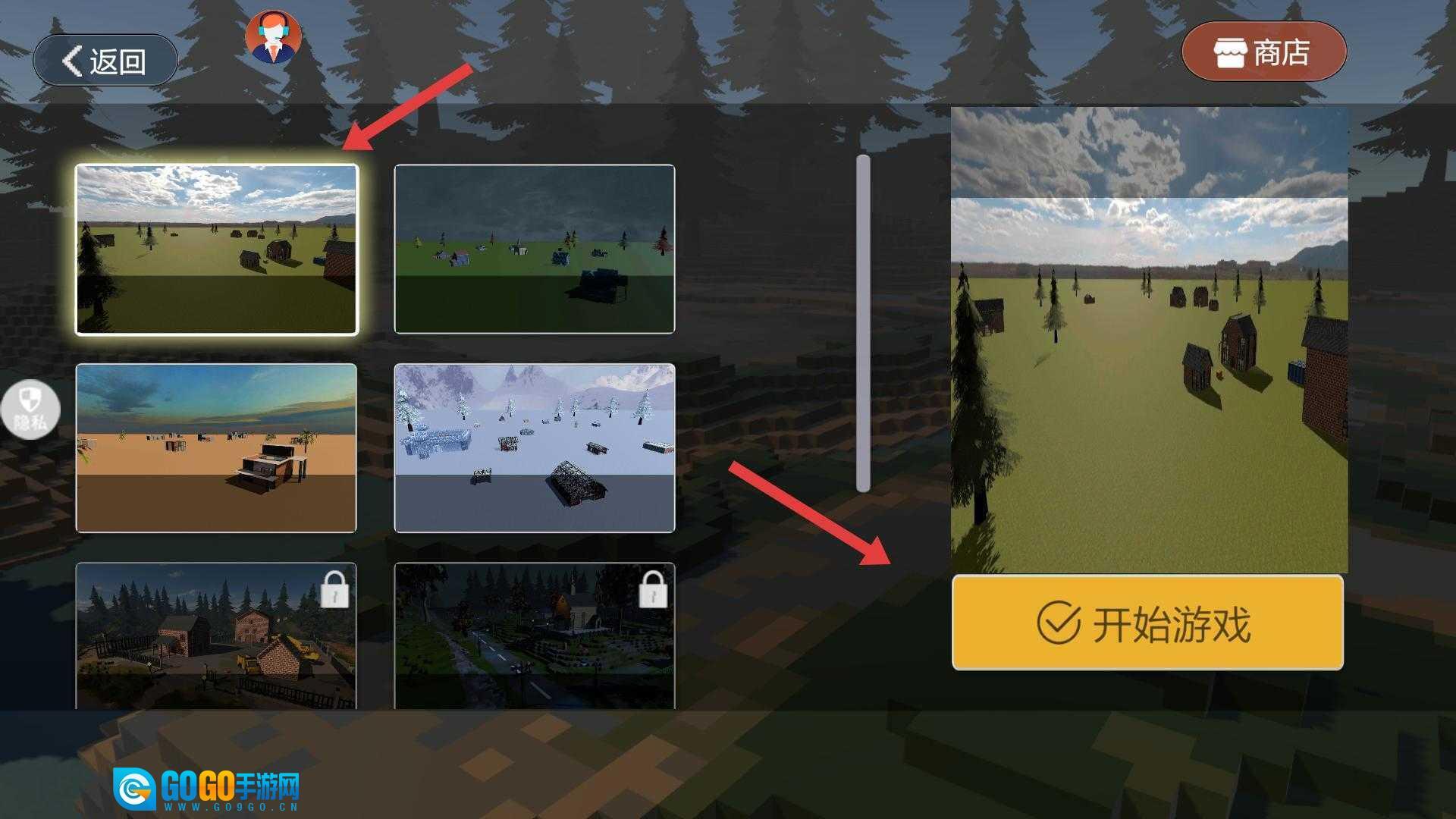 在场景选择界面,有多个不同像素风格的场景可供挑选,选定后点击“开始游戏”按钮,即可进入所选场景开启冒险之旅。