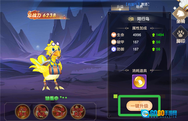 给坐骑进行升级操作,可以提升其生命、破甲、防御等多项属性。