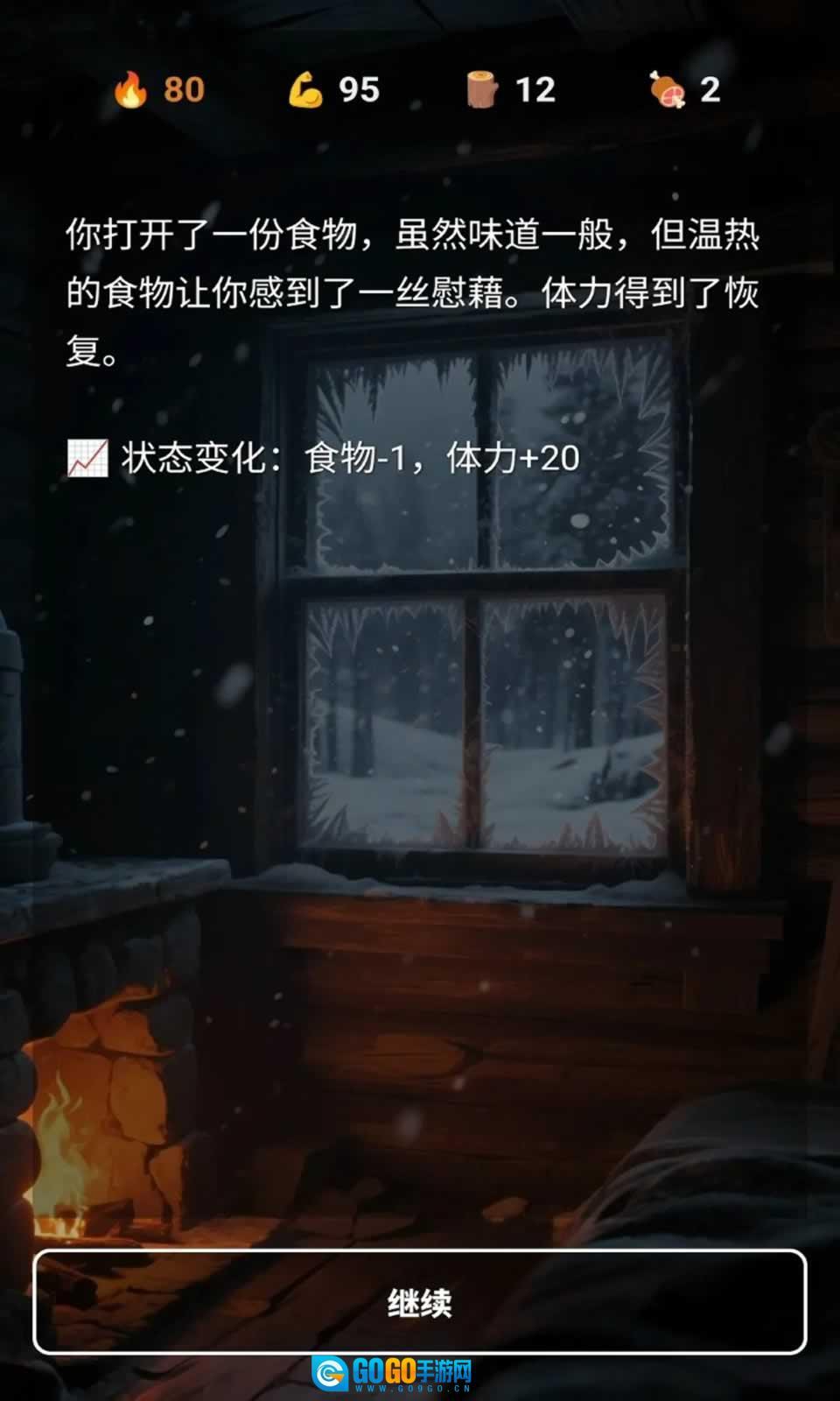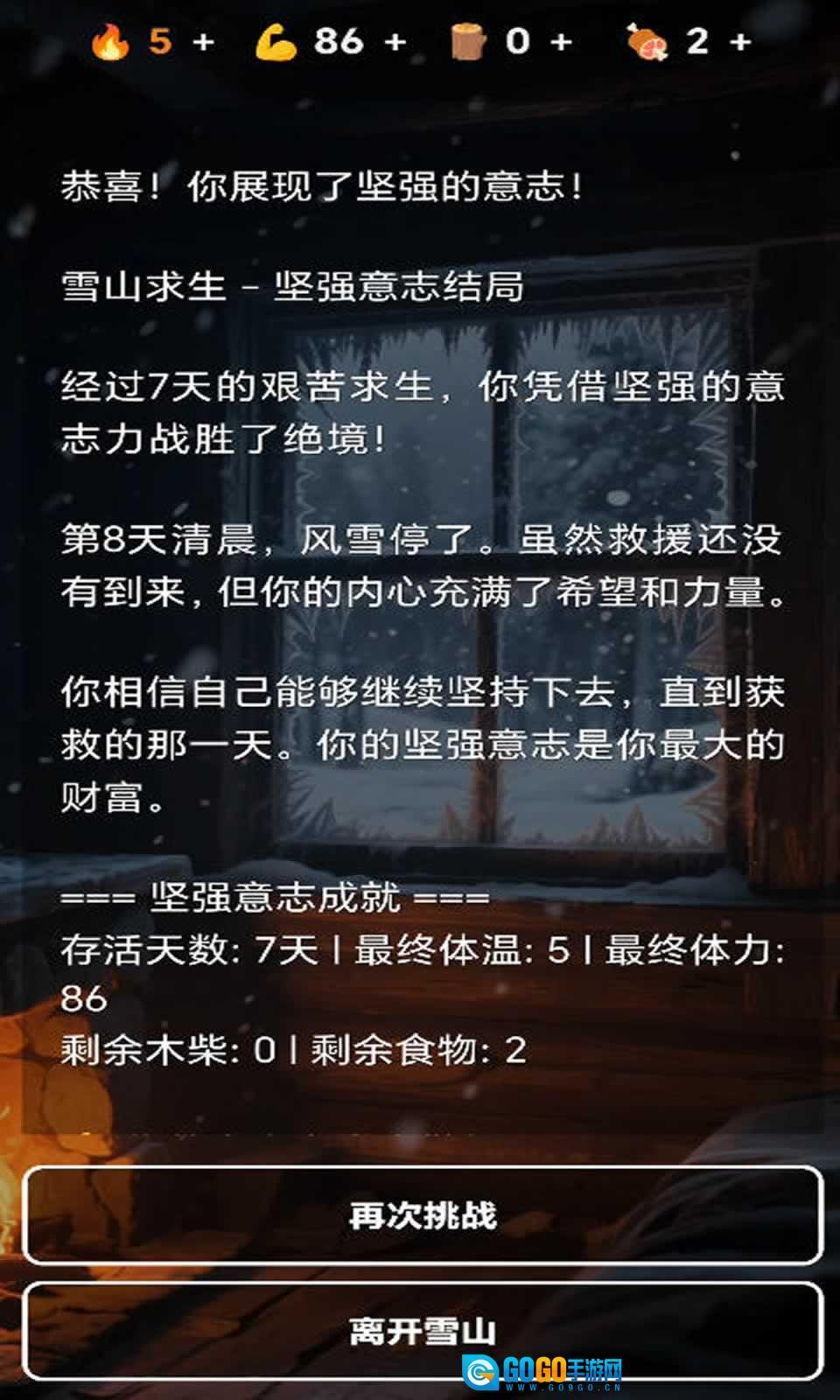 管理资源:维持体温是生存的关键。食物与木柴是你仅有的希望,务必谨慎使用。
