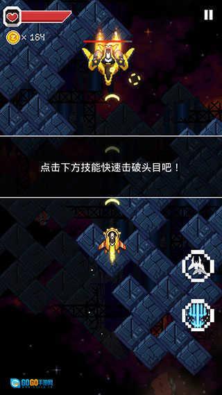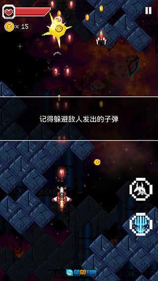 滑动手机屏幕就能操控战机移动,子弹会自动发射,点击右上角的暂停按钮可以调整滑动速度。