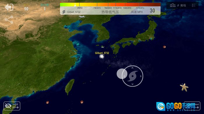 陆地上设有防御系统,会发射导弹来削弱你的能量,因此在你实力尚未足够强大时,最好避开陆地,去海面上搜寻更多资源,以达成成为终极飓风的目标。