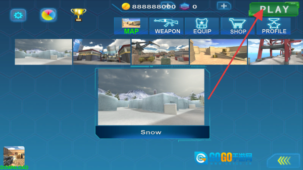 在游戏的准备界面,点击PLAY按钮就能进入游戏地图,你可以提前了解MAP、WEAPON等功能选项,为游戏做好准备。