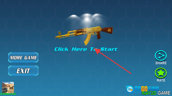 在游戏的启动界面里,找到“Click Here To Start”按钮并点击,就能进入游戏,开启你的射击游戏冒险之旅。