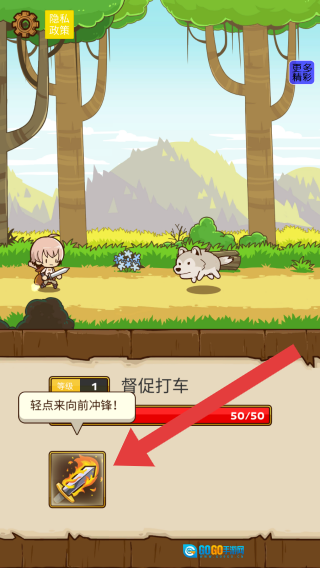 玩家手持武器踏上冒险之旅,需轻点技能图标发动向前冲锋的攻击来应对敌人,场景中会出现督促打车的提示信息,界面下方设有对应的技能图标。