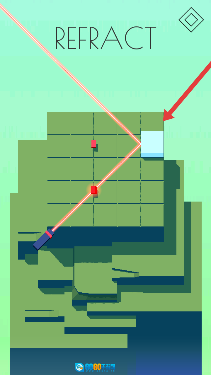 在折光游戏里,你得拖动浅蓝色的棱镜,调整它的摆放位置,让红色激光通过折射后能抵达目标区域,以此完成光线的引导任务。