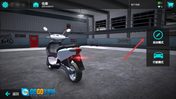 在模式选择页面,选择【自由模式】,然后将场景切换到仓库,这样就能不受限制地操控电动车,熟悉骑行的手感了。