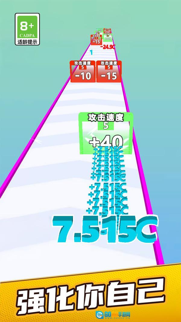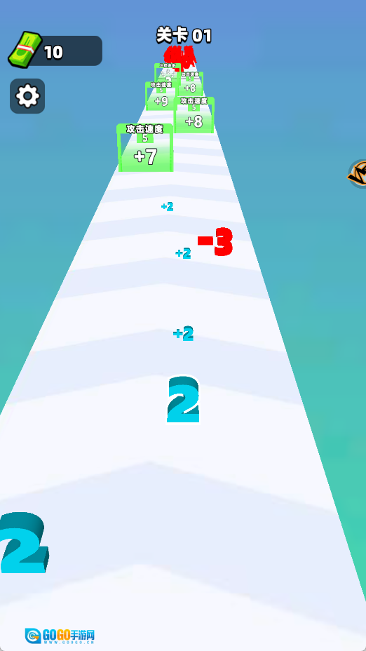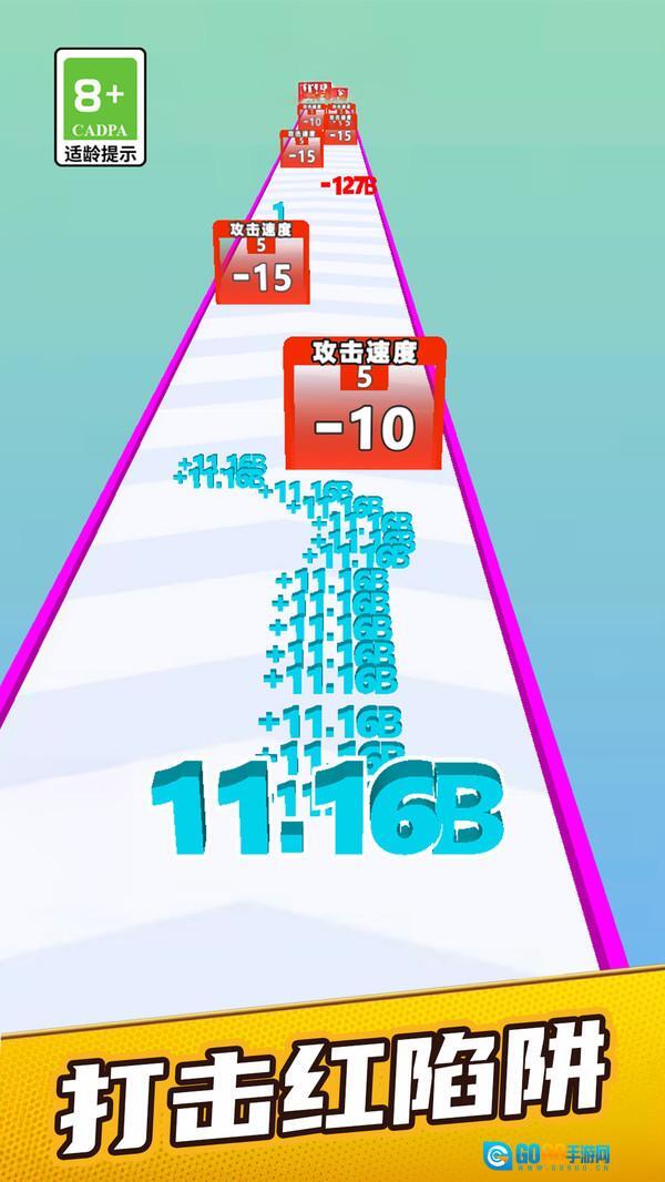 跑道上会随机出现带有数值的道具,玩家需要快速将其拾取,借助这些道具带来的效果,能让数字获得更快的移动速度,从而实现持续成长。