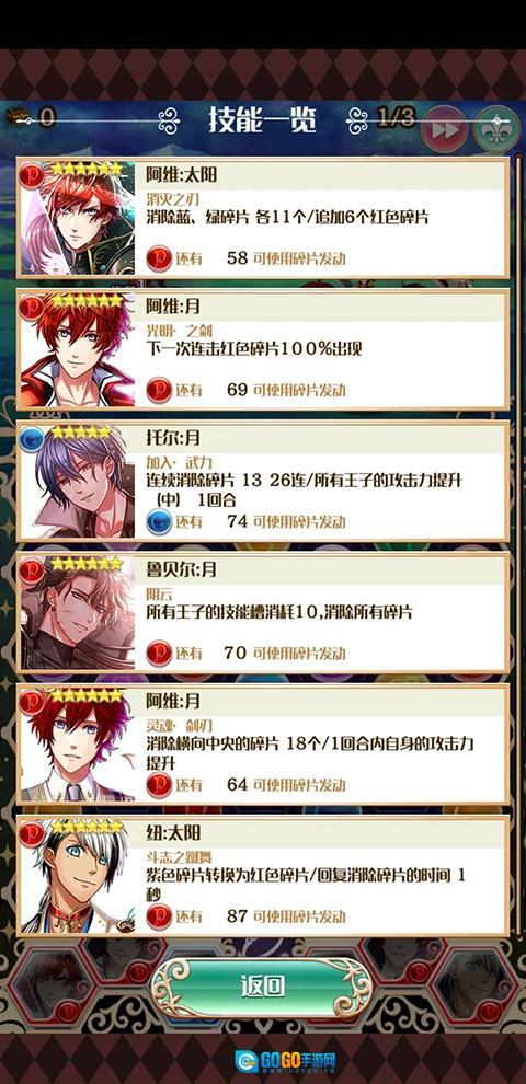 进入关卡后,要是对王子们的技能效果不太确定,不用急着点消消乐的主界面,先点一下右上角的“技能一览”,就能把每个王子的技能都看得明明白白啦。