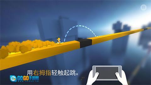 打开游戏后进入初始教程环节,用右手拇指点击屏幕来操控角色,使其跳过黑色的障碍物。