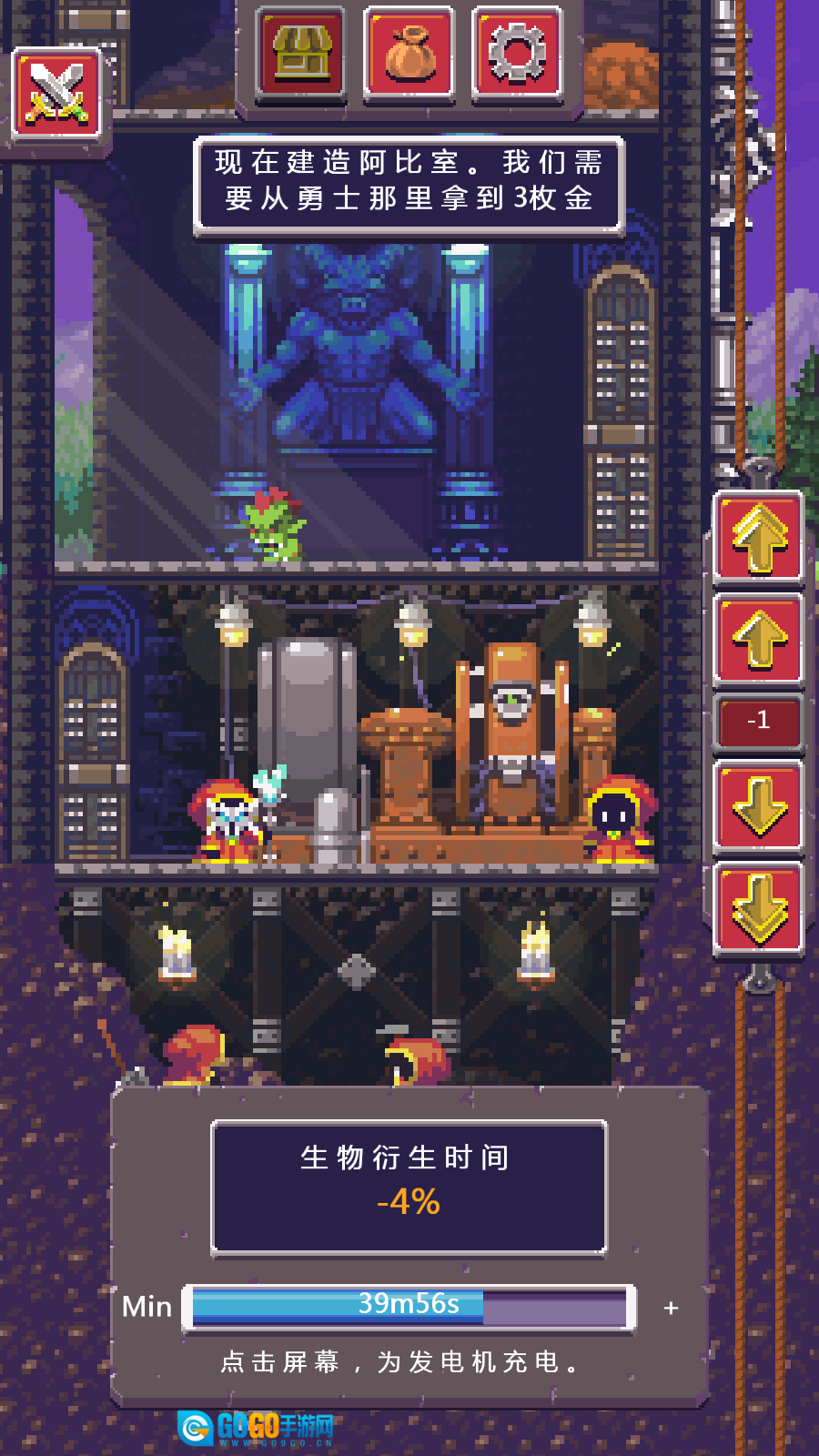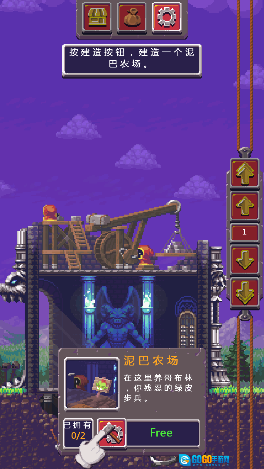 按照新手教程指引,点击画面右侧的箭头来选择层级,接着建造你的第一层房间,从而生产哥布林。