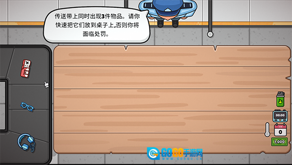 游戏开始时挑选合适的难度等级,把传送带上的物品有序地摆放到桌面上。