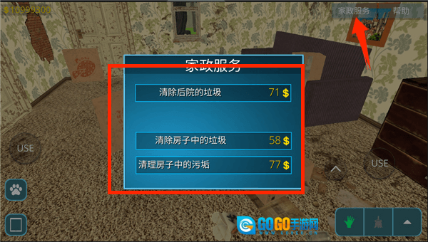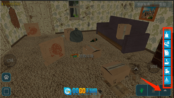 成功进入房间后,点击右下角的这个图标,就能用道具清理垃圾了。