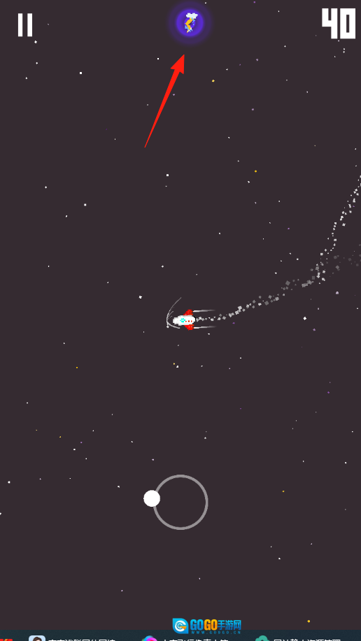 飞行状态下(红箭头标识),留意移动轨迹(白色星尘状),及时调整行进方向,避开沿途障碍,收集散落的道具(星星飞船样式)。