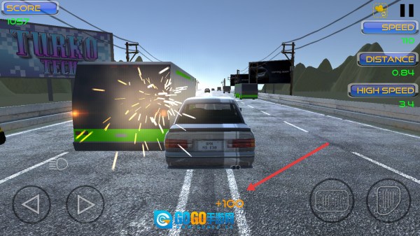 驾驶过程中要避开货车,发生碰撞会被扣分,吃到“+100”的道具就能增加分数,同时留意右侧显示的Speed、Distance等数据,尽量保持高速状态冲过终点线。