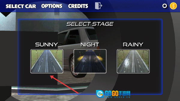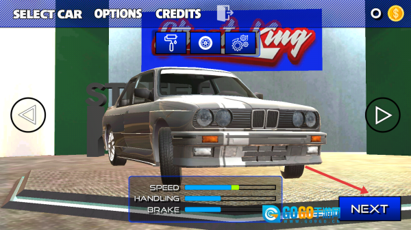 选择银色轿车(需查看Speed/Handling/Brake属性),点击【NEXT】按钮,即可进入场景选择界面。