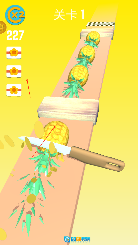 在规定时间内达成水果切割目标就能通关,积累的分数可以解锁钻石刀具、光效刀刃这类特殊道具,助力挑战更难的关卡。