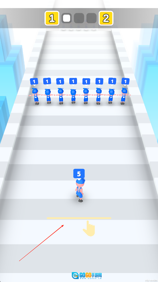 操控队伍向前冲刺,遇到人墙时留意对方头顶的数字,挑选比自身数字小的人墙进行撞击,撞击成功后数字会叠加;若遇到数字更大的人墙,则需要绕行或者召唤更多伙伴。