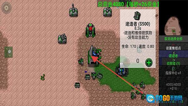 在单位建造界面中,会展示“建造者($500)”的相关信息。该单位具备建造与维修建筑的功能,能够助力玩家拓展基地规模、发展军事力量,进而增强游戏的策略性。