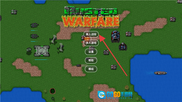 在游戏的启动界面上,能看到“Rusted Warfare”的字样,界面中设有“单人战役”“多人游戏”“设置”等选项,玩家可以通过这些选项开启不同的游戏玩法。