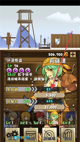 在角色界面中,可查看“莉莲達(沙漠怪盜,Lv76)”的属性情况。通过升级操作,该角色的攻击力(例如数值435)与生命值会得到提升,进而增强整体战力。