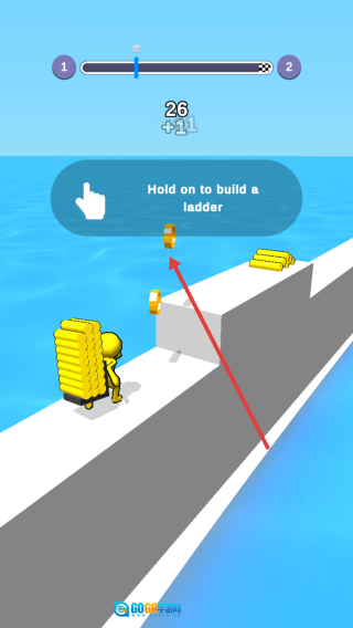 遇到高台时,长按“Hold on to build a ladder”按钮,消耗金币搭建梯子,就能翻越障碍继续奔跑。