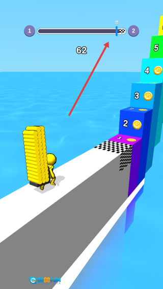 冲过彩色阶梯(1到5级),收集金币,积累62进度,抵达终点,赢取奖励,解锁新角色。