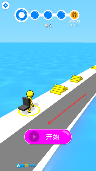 点击【开始】按钮,控黄人推动金币堆,沿着水上的道路前进,途中收集金条,注意避免掉入水中。