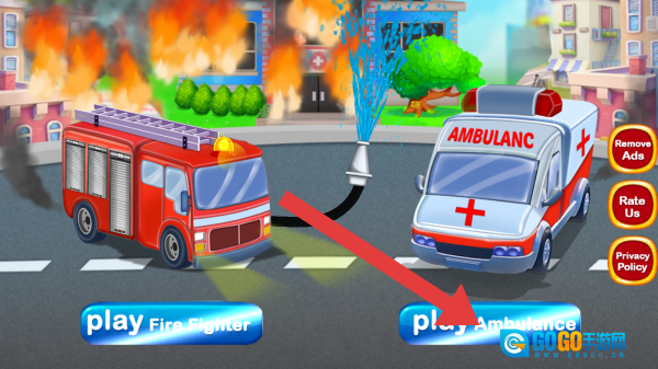 这款应用包含“playFireFighter”和“playAmbulance”两种核心玩法,界面右侧设有“RemoveAds”“RateUs”“PrivacyPolicy”等功能按钮,整体围绕模拟应急救援工作展开,玩家可体验消防员、急救人员等不同救援角色的工作内容。
