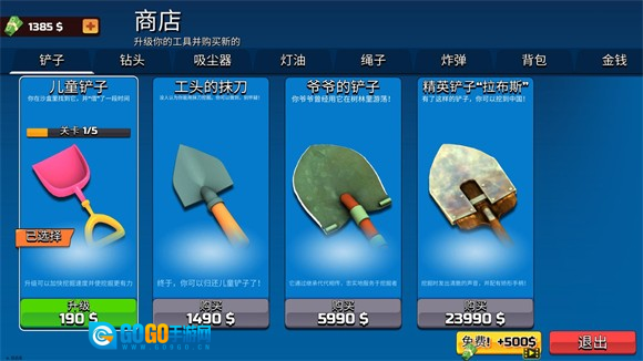 在商店里,消耗金币能够解锁新的挖掘工具,也可以对已有工具进行升级。