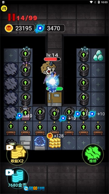 在战斗过程里,玩家要逐步积累金币与电气,用来搭建各类防御设施,像能量护盾、扫帚炮塔、旧游戏机之类,每一种道具都具备不一样的功能。