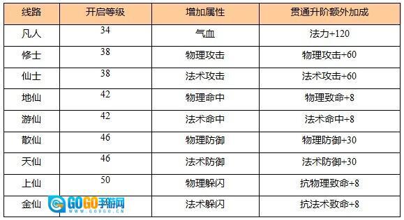 每条修仙线路开启等级不同,所增加属性也不相同。