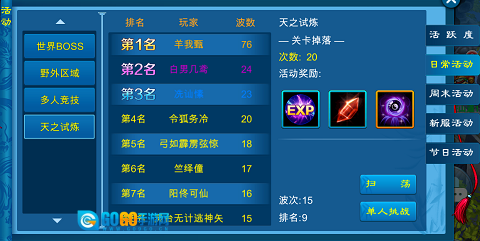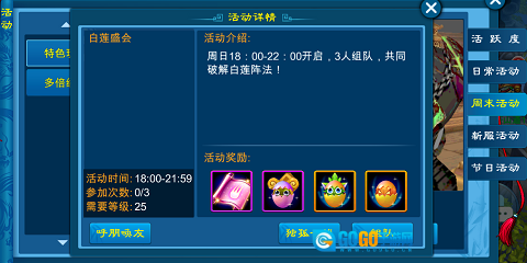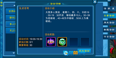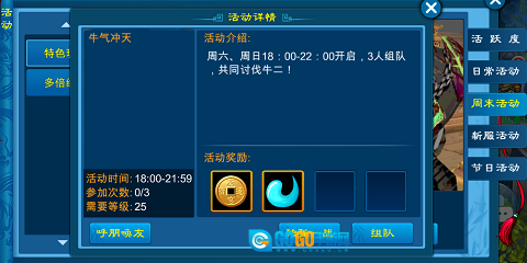 周六和周日的18点到22点会开启活动,参与乱舞苍穹、百鬼夜行、野外副本以及探宝副本都能享受双倍经验加成,可不要错过啦。