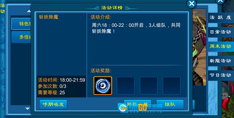 周六晚上6点到10点开放活动,邀请两位伙伴组队,一同挑战妖魔。参与就能收获丰厚灵气,想要打造极品装备,这次机会可别错过!