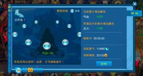 每条修仙线路都得修炼到圆满状态才能进行升阶,升级过程中会消耗真气与铜币,不过紫色和橙色品质的升阶还额外需要消耗特定道具【千年神水】。