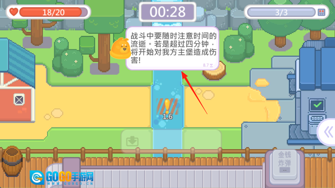 战斗过程中要留意时间,别让时长超过四分钟,以免主堡受到损伤,同时也要把控好挑战的节奏。