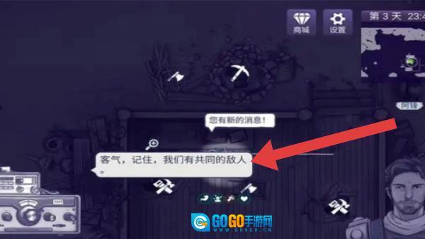 这段剧情互动或任务推进环节包含多种元素:实体信息方面有“第3天23”标识,以及“商城”“设置”两个功能按钮;对话文本则包括提示语“您有新的消息!”和角色台词“客气,记住,我们有共同的敌人”;除此之外还涉及道具、角色等内容。