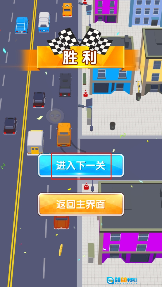 当我们成功通过当前关卡后,只需点击屏幕下方那个蓝色的“进入下一关”按钮,就能开启难度更高的道路驾驶挑战了。