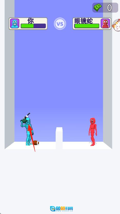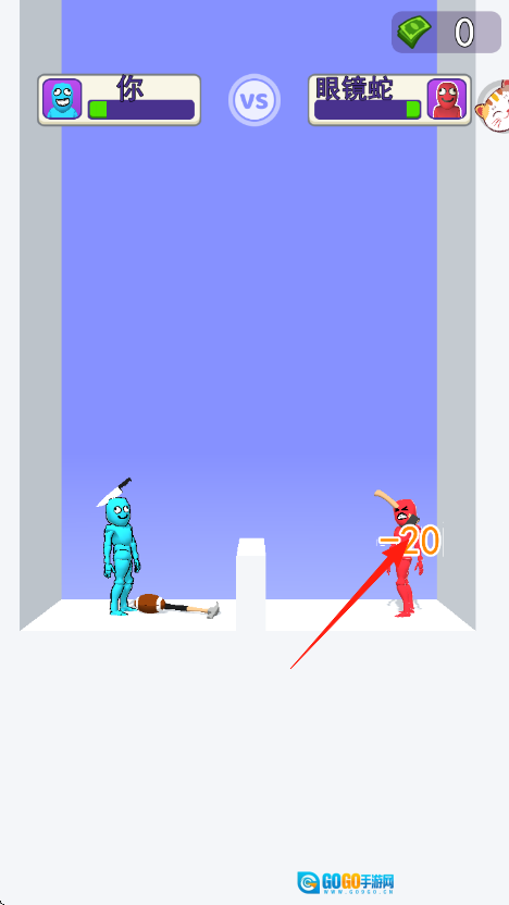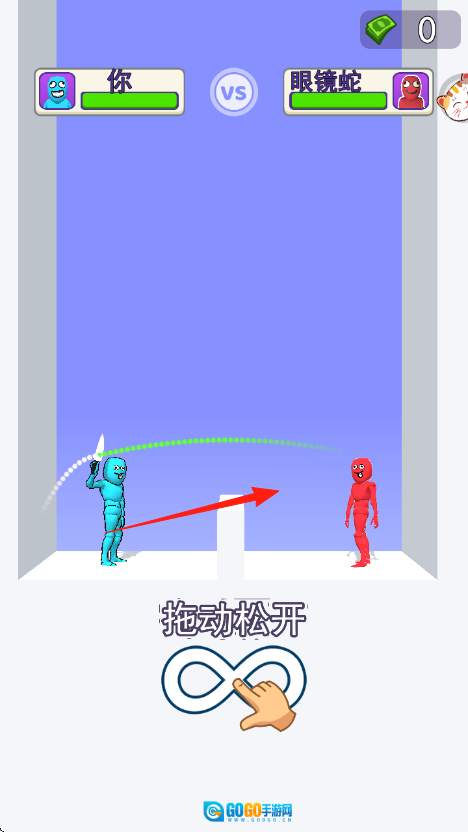 拖动蓝色橡皮人手中的刀与球棒,调整好投掷的力度和角度,松开手来攻击红色的敌人眼镜蛇。