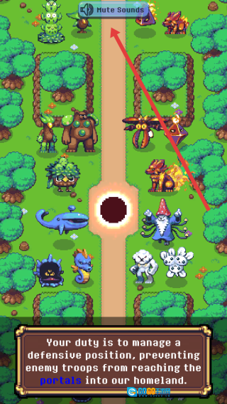 在地图推进的过程中,你可以点击顶部的喇叭图标来关闭音效,同时留意底部的提示弹窗,清楚自己的任务是布置防御工事,阻止敌人向传送门发起进攻。