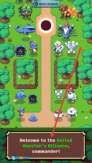 进入United-Monster's-Alliance游戏的初始地图场景,阅读底部对话框中的欢迎语,熟悉怪物联盟的世界观,为开启防御任务做好准备。