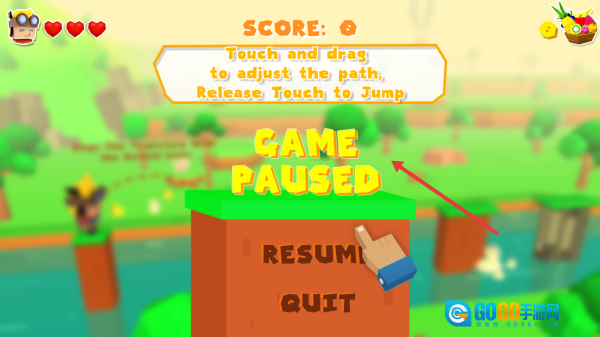 在游戏里,你可以通过Touch and drag的方式拖曳来调整跳跃的轨迹,松开后角色就会发起跳跃,过程中需要跨越河流、收集金币并避开各种障碍。