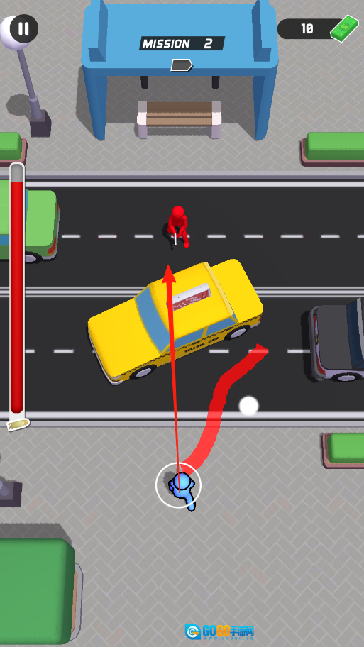 在通过车流第二关的黄色出租车时,要提前预判车辆的移动轨迹,借助绳索勾住路沿或建筑来调整行进路径,从而避开出租车。
