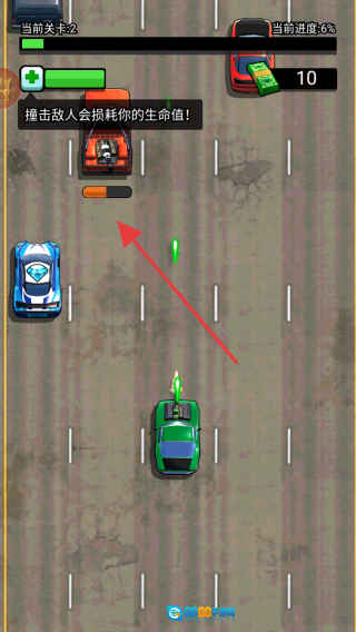 在游戏的第二关中,你需要继续操控赛车进行移动,并撞击敌方车辆。不过需要留意的是,撞击敌人会消耗你的生命值,所以得合理规划赛车的行进路线。