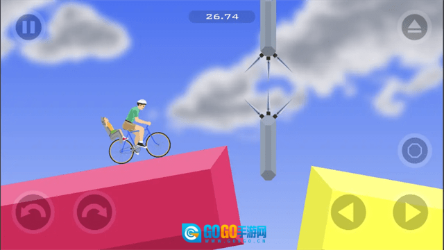 屏幕上一共有五个操作按钮,左下角的三个分别是跳跃、左倾和右倾,借助左边这些按钮能调整平衡,而屏幕右下角的两个按钮是前进和后退。