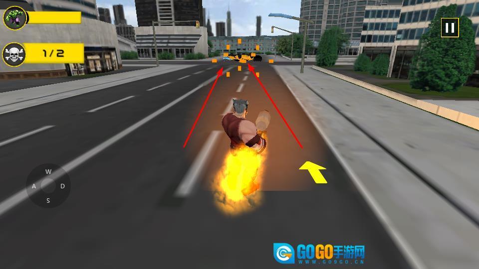 点击右侧的技能按钮释放攻击,对黄色汽车造成伤害,以此完成摧毁任务。